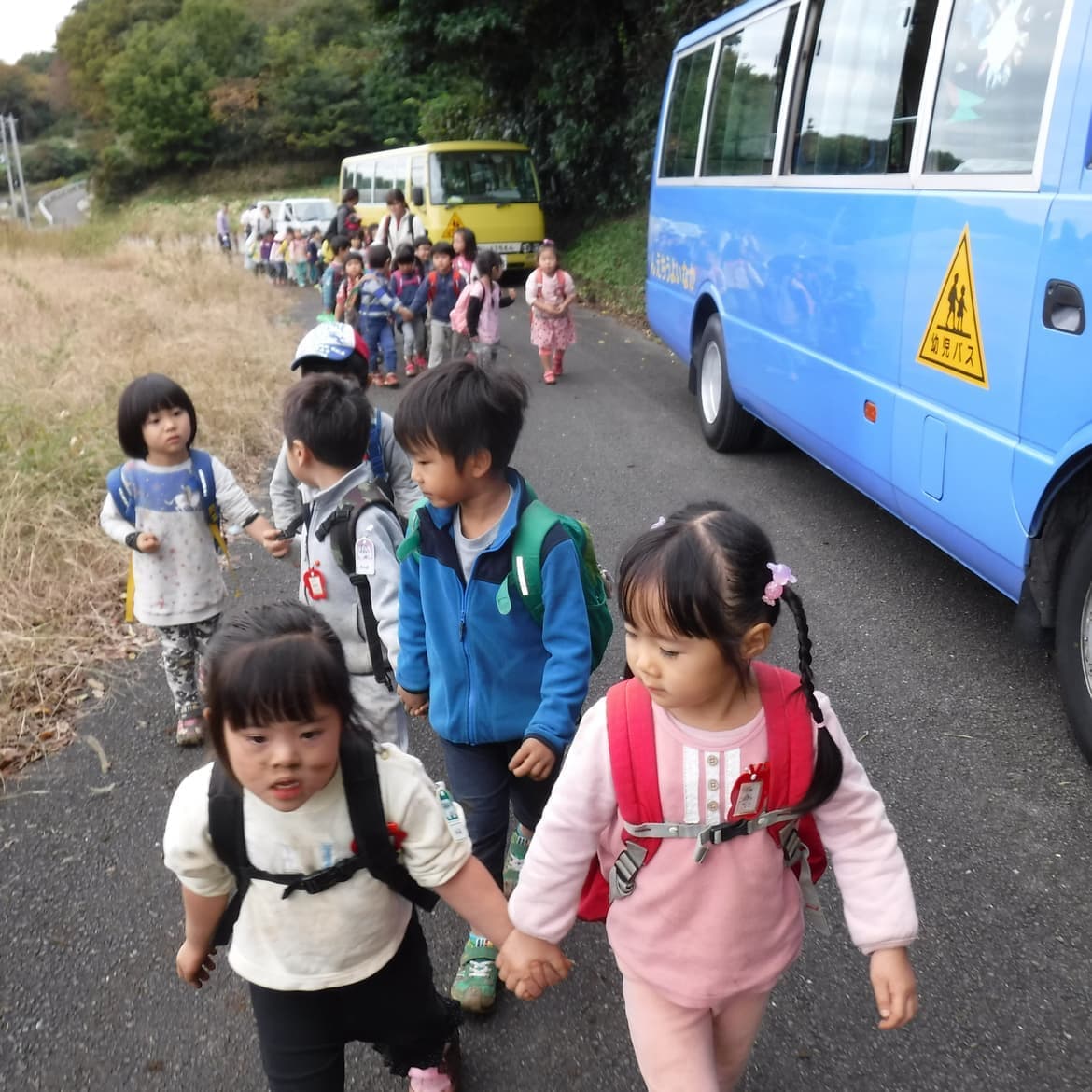3台のバスや徒歩で順次登園します。
